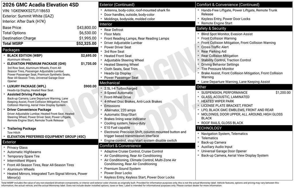 Summit White 2026 GMC Acadia Elevation FWD 8-Speed Automatic 2.5L DOHC FWD, After Dark Cloth.